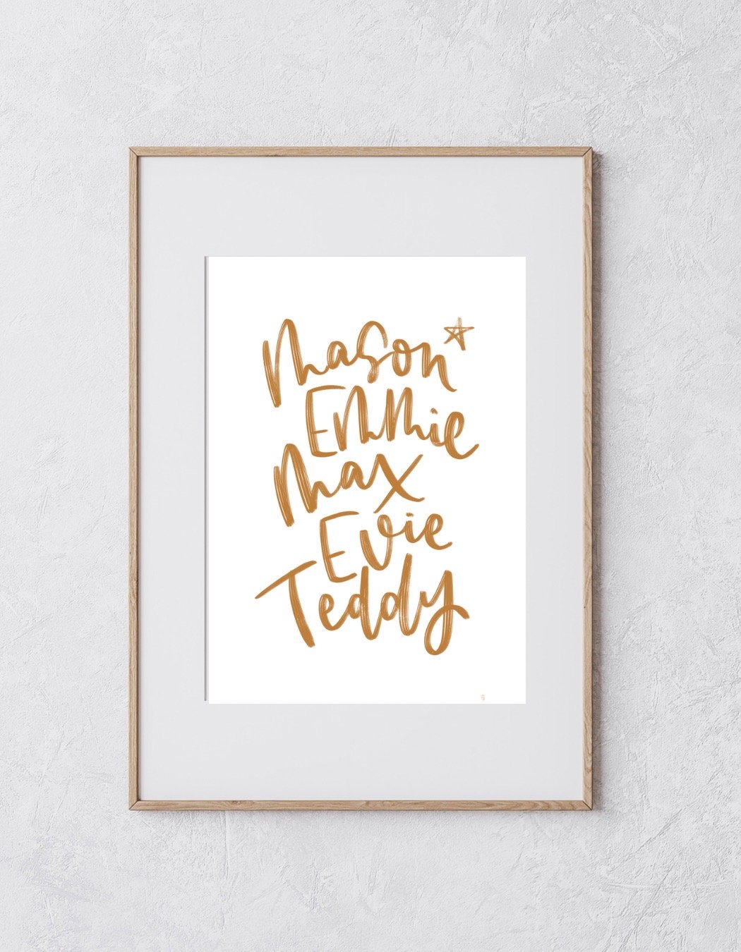 Featuring our classic hand lettered calligraphy, our personalised print is the perfect way to put your mark on your home. Whether you've had your first or have finished your family together this print show cases everything you value and place importance on - your family. This contemporary print also makes a perfect gift for birthdays, Christmas or Mother's Day.