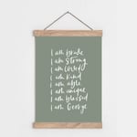 Please select the size you require from the drop-down menu and add the names and colour of lettering you would like in the notes box at checkout. If you would like any of the I Am statements changed leave a note of which ones to leave out and what to replace it with.