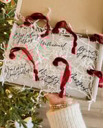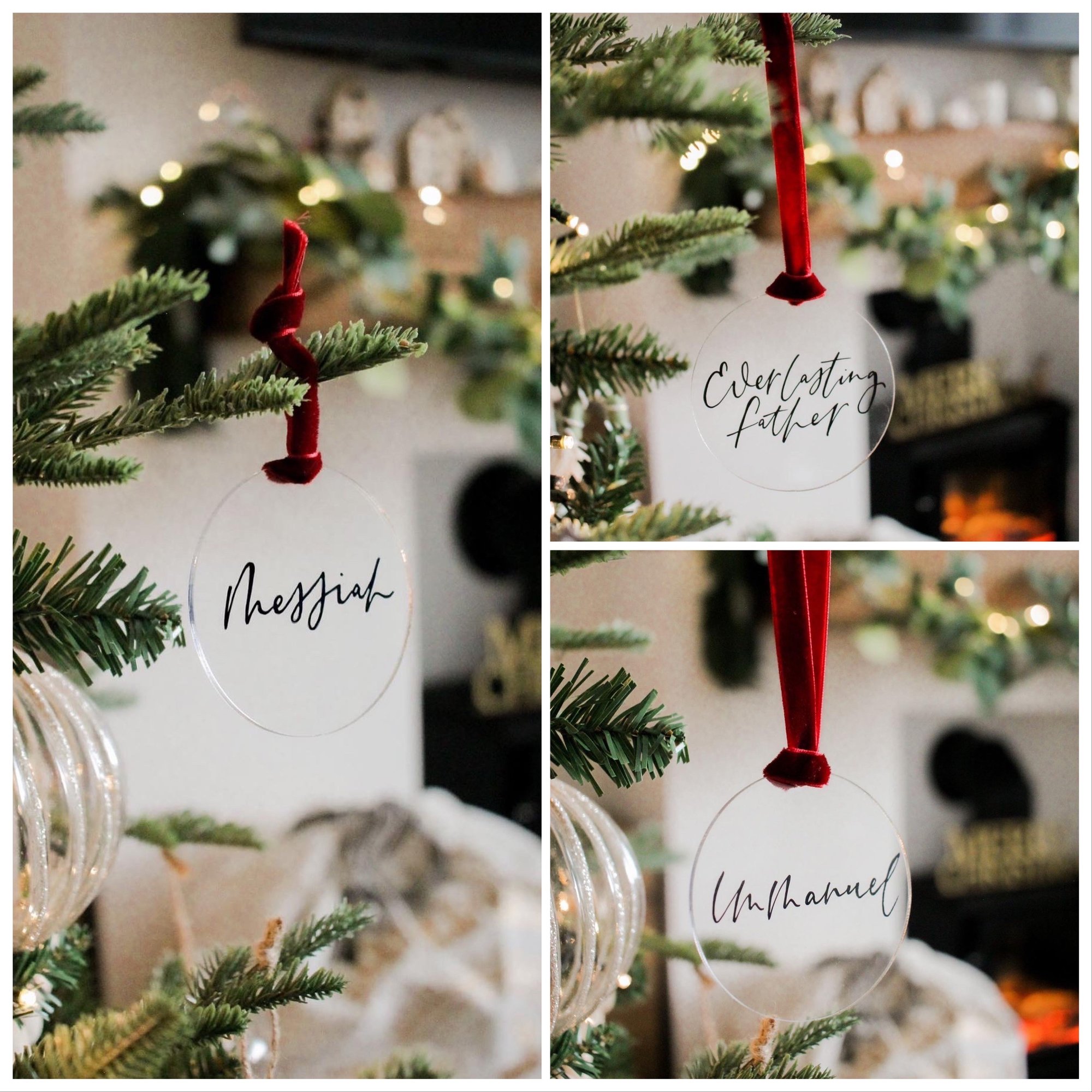 Six handlettered clear acrylic tree decorations featuring the names of Jesus finished of with luxurious bright red velvet ribbon.