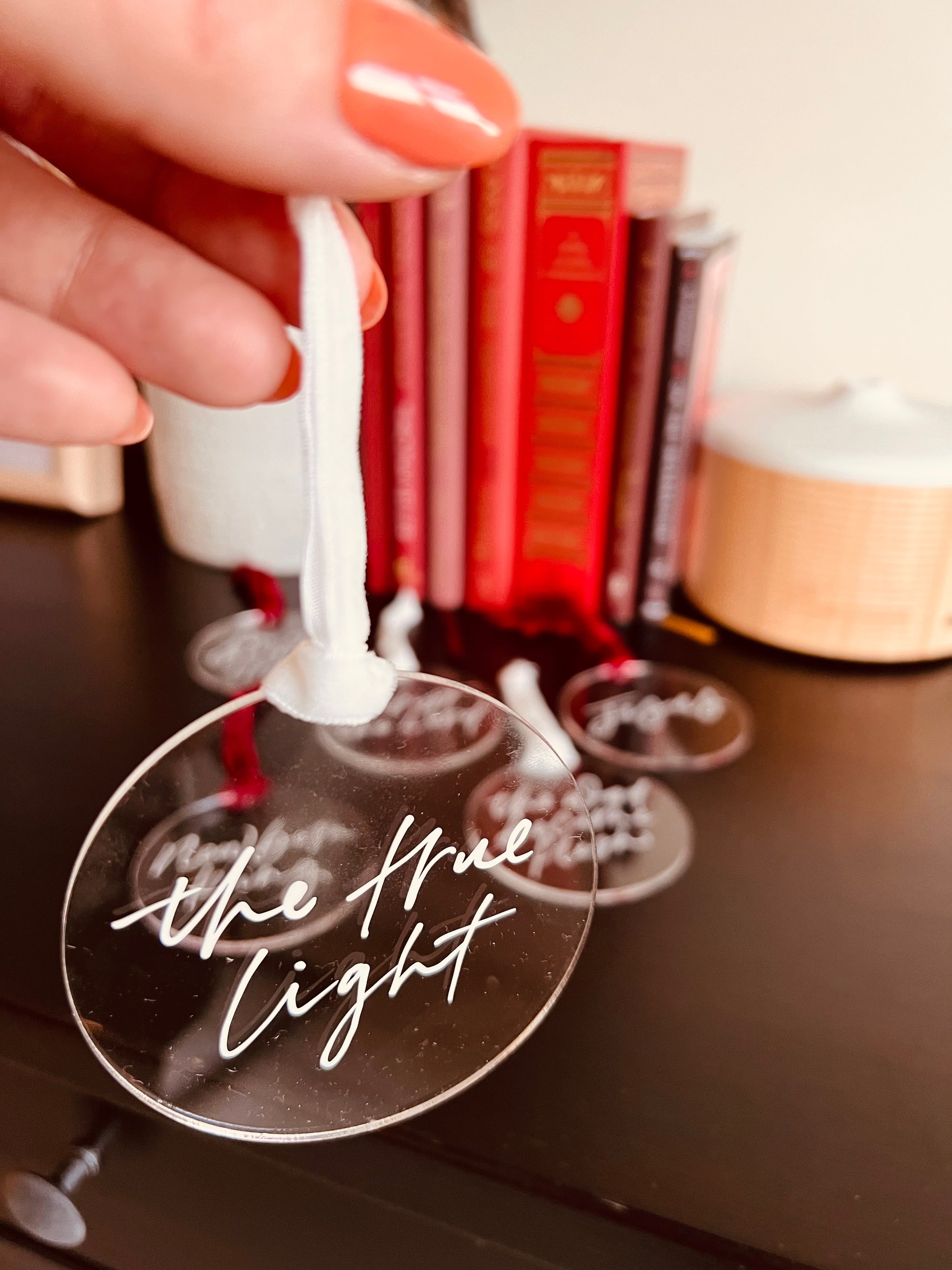 Choose between white or red velvet ribbon to accent these NEW names of Jesus Christmas decorations.