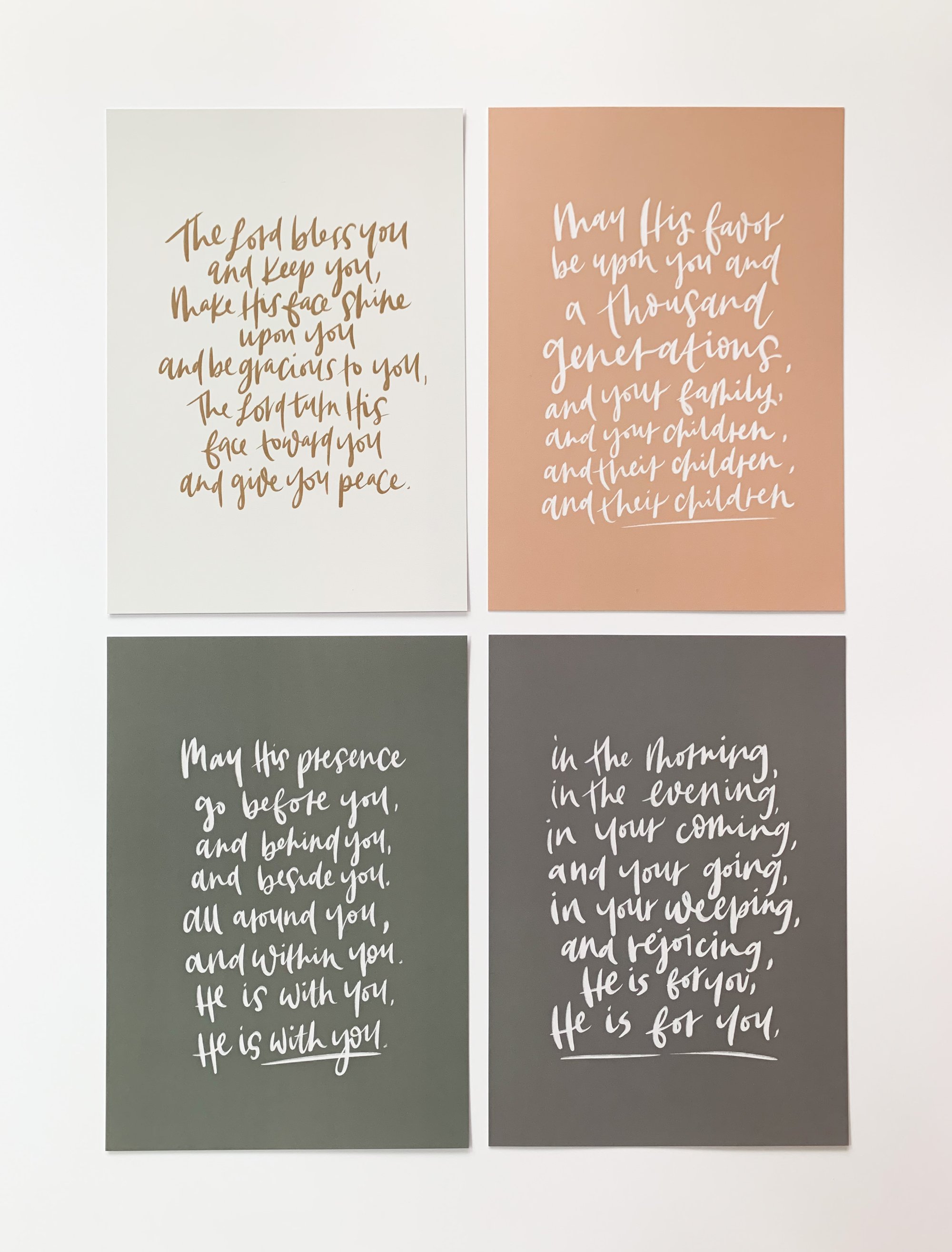 A stunning collection of A4 handlettered art prints on muted tones featuring the lyrics of the extremely popular hymn written during Lockdown called ‘The Blessing’.